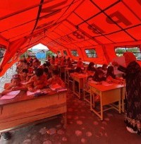 Ia menambahkan, meskipun proses belajar mengajar dilakukan dengan fasilitas seadanya di bawah tenda pengungsian, semangat para siswa dan guru tetap tinggi.