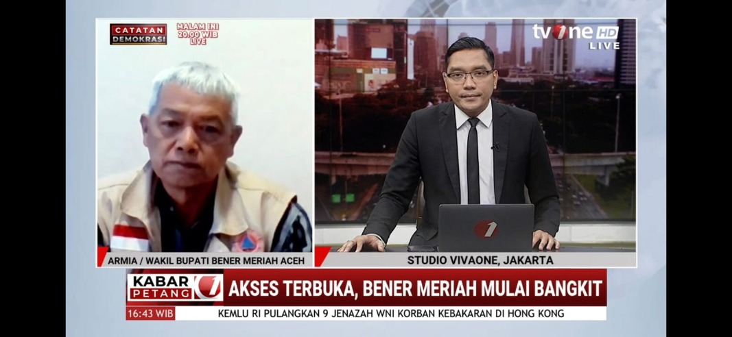 Hal tersebut disampaikan Ir. Armia saat menjadi narasumber dalam program Kabar Petang di TV One, Selasa, 23 Desember 2025, dengan tema Penanganan Bencana Hidrometeorologi di Bener Meriah.